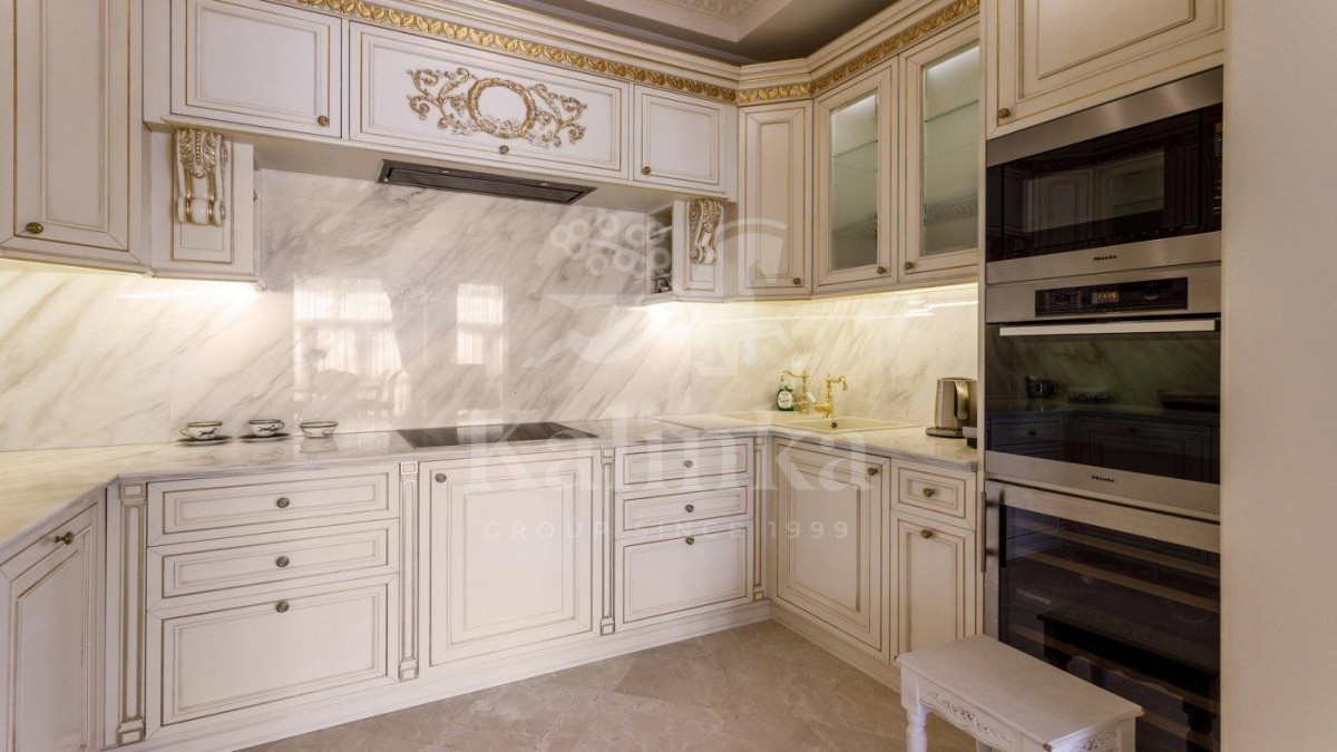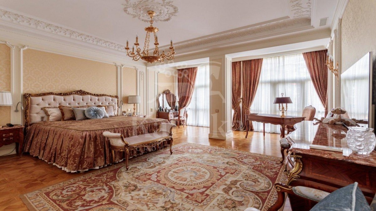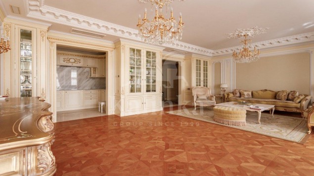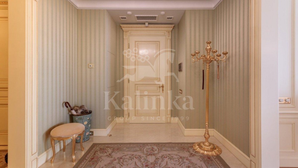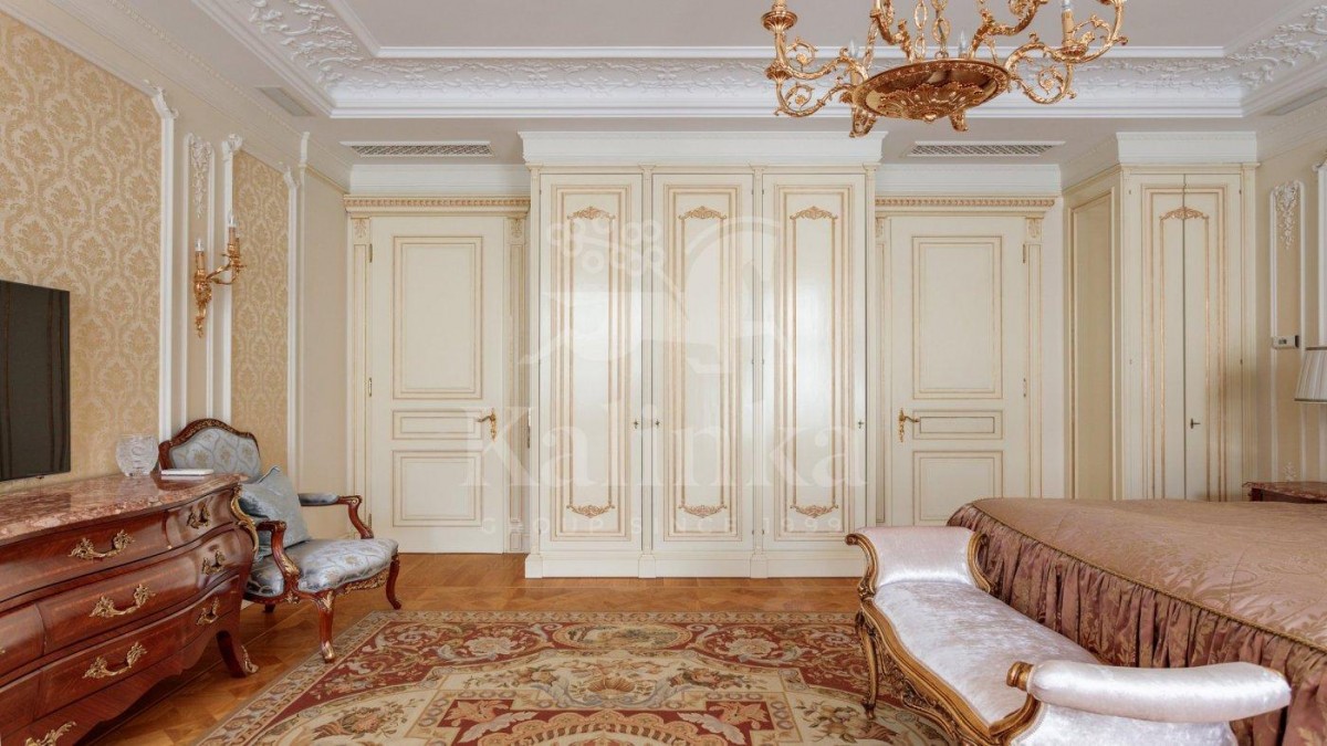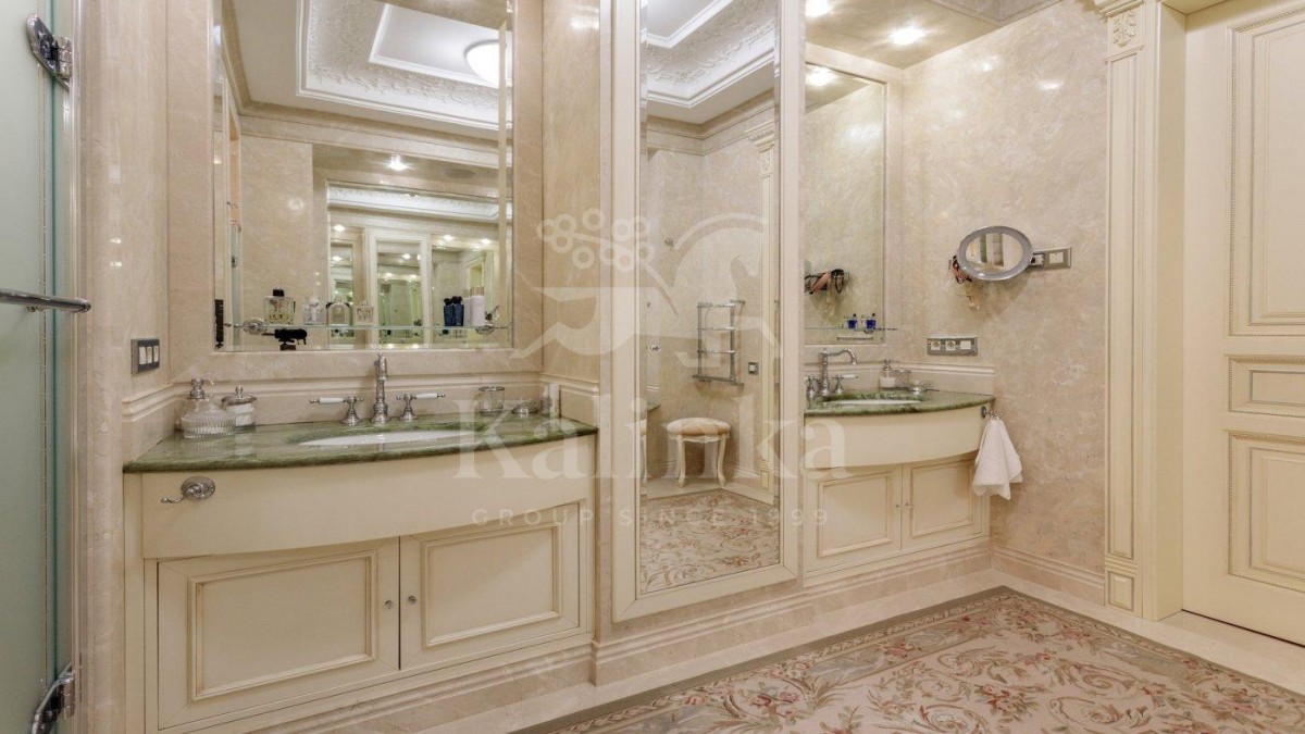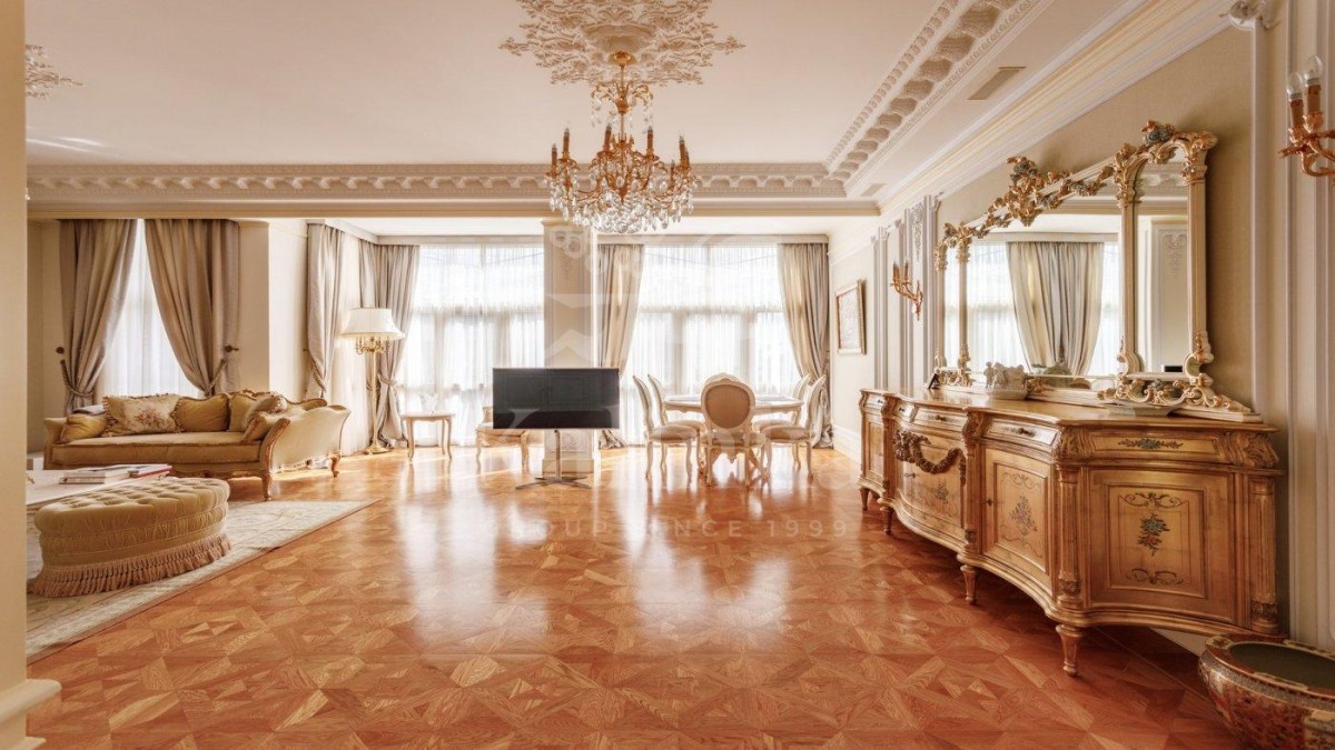 Просторные комнаты с высокими потолками, отделка мрамором и натуральным деревом формирует атмосферу респектабельности и утончённого вкуса. Интерьер выдержан в стиле изысканной классики с акцентом на благородные материалы. Высокие потолки, лепнина ручной работы и изысканные декоративные детали создают ощущение масштаба и величия.