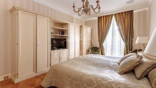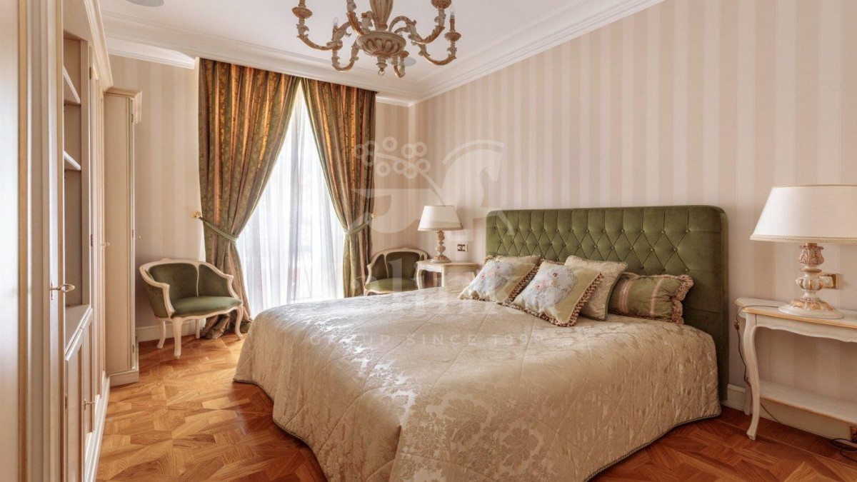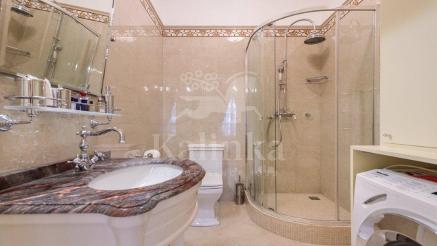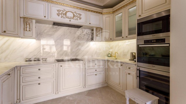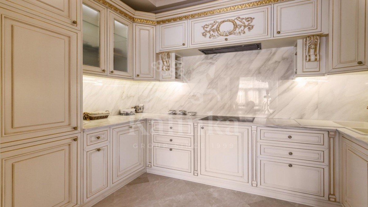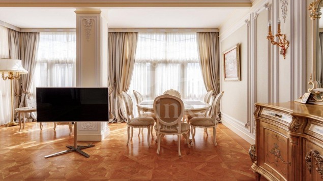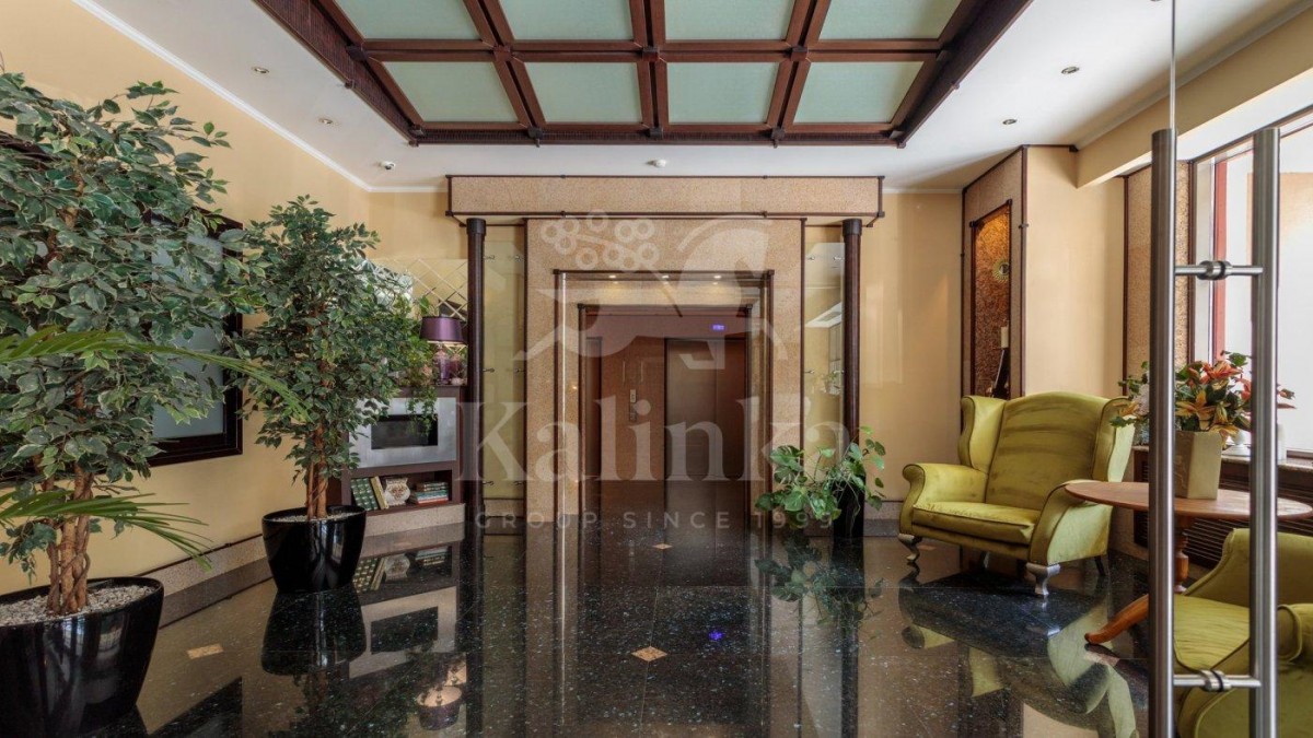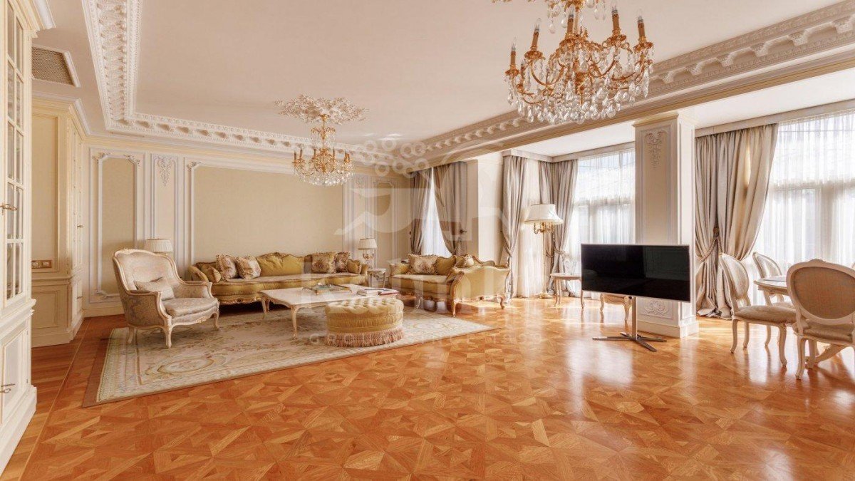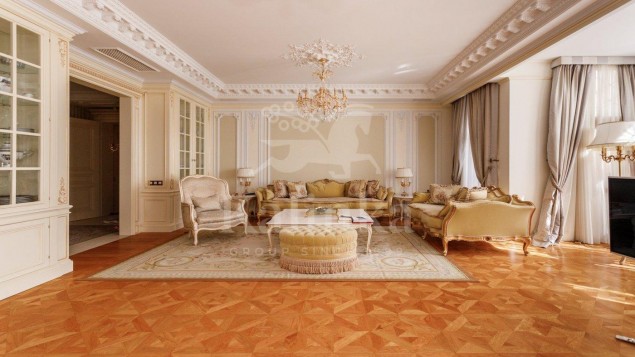 Просторные комнаты с высокими потолками, отделка мрамором и натуральным деревом формирует атмосферу респектабельности и утончённого вкуса. Интерьер выдержан в стиле изысканной классики с акцентом на благородные материалы. Высокие потолки, лепнина ручной работы и изысканные декоративные детали создают ощущение масштаба и величия.