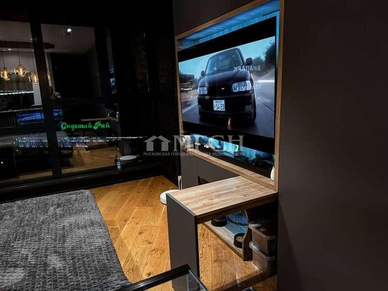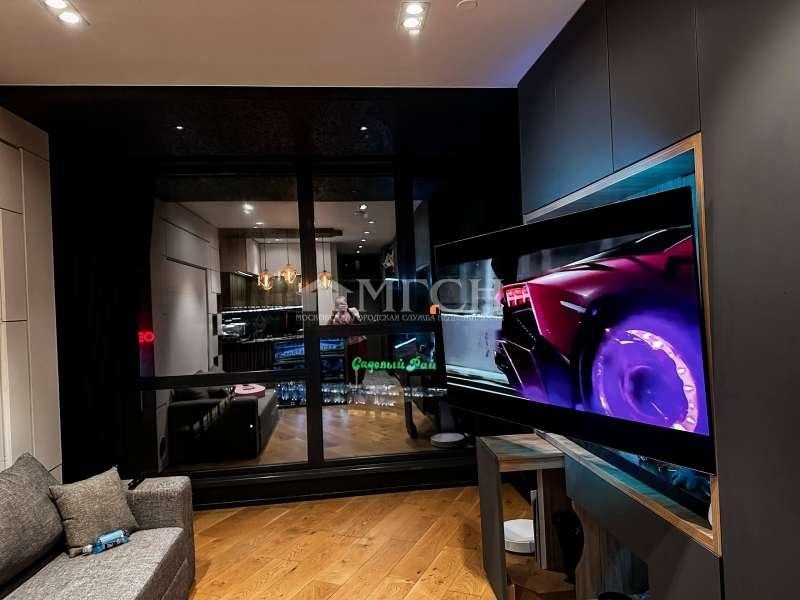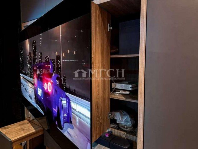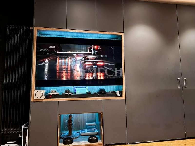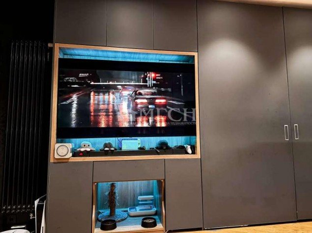 За телевизором расположены глубокие скрытые шкафы, где установлена приставка и один из трёх мощных роутеров. Также выведено оптоволокно, скорость интернета максимально возможная на сегодняшний день.