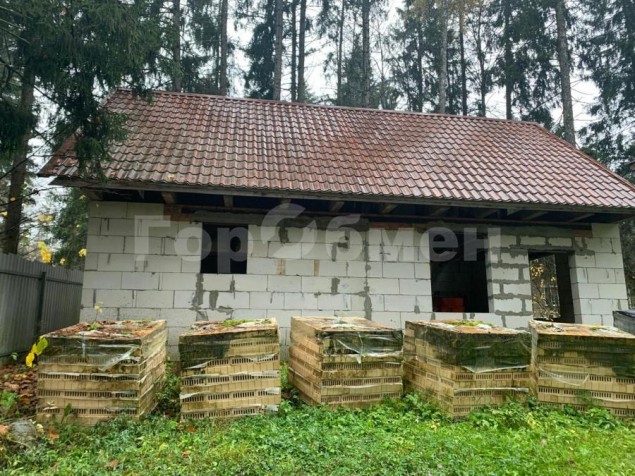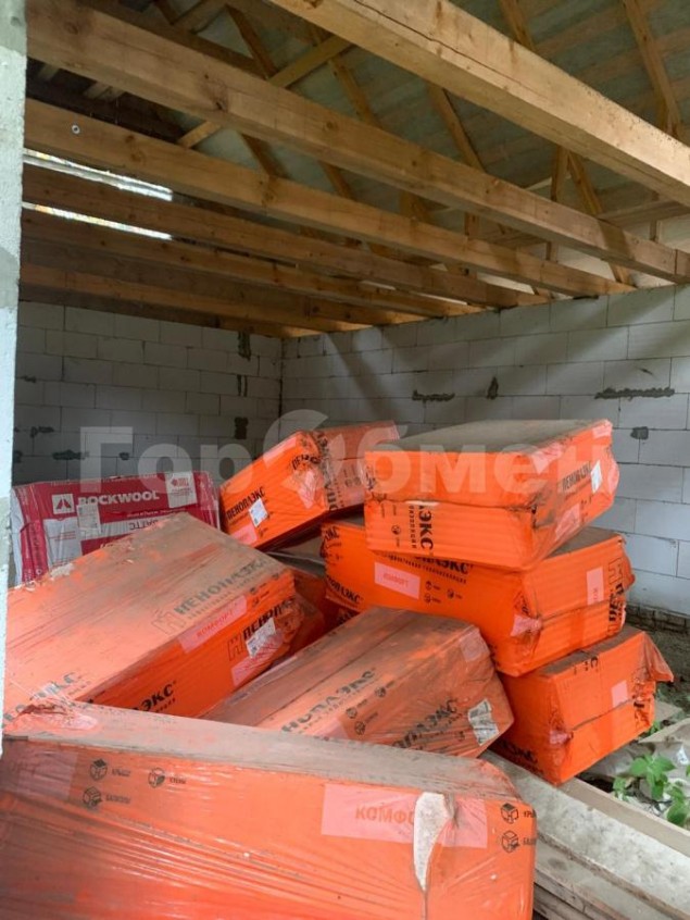 • Хозблок 120 м²: Возведена коробка из пеноблоков. Имеется кирпич и утеплитель для его отделки в одном стиле с основным домом.