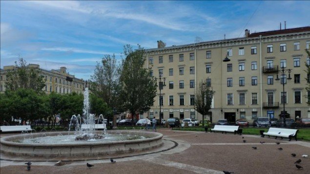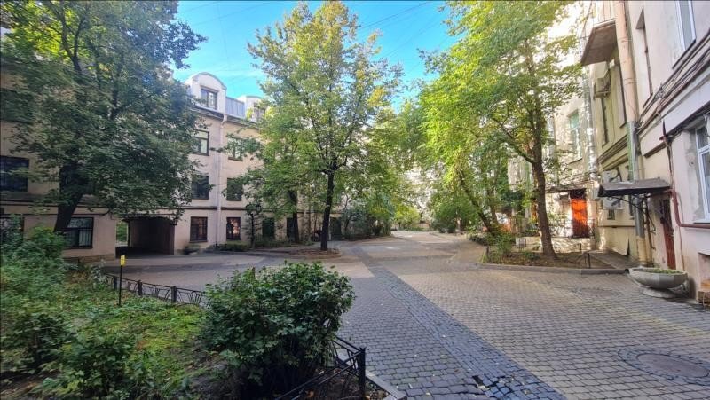 Отметим, что двор дома благоустроен, вымощен камнем, организованы зеленые зоны, освещение. Въезд машин во двор запрещен, так как этот и соседние дворы образуют единую пешеходную зону квартала от Караванной до Малой Садовой.