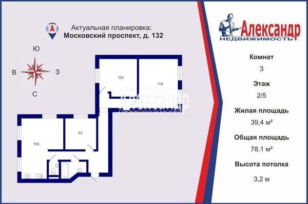 Продажа трех-комнатной квартире в Московском районе СПб. Площадь квартиры: 78.1 м2, жилая площадь: 39.4 м2, площадь кухни: 19 м2, 2/5 этаж. Цена 18 900 тыс. руб. Описание, информация о продавце.