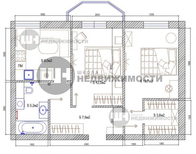 Правильные формы комнат, раздельные спальни площадью 12 и 13,7 кв.м. фунциональная кухня 9 кв.м.