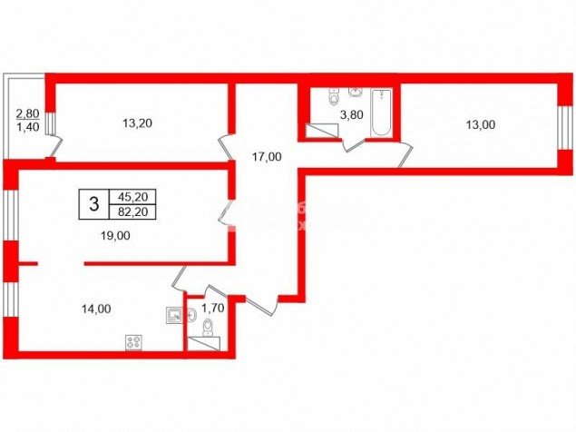 3 изолированные комнаты (18 м2, 13 м2 и 13.2 м2) + кухня 14 м2