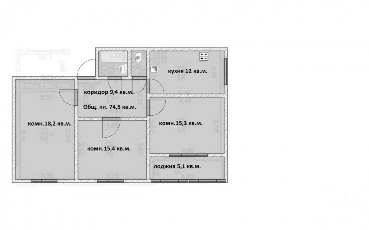 Общая площадь - 74,5 кв.м.( без лоджии).