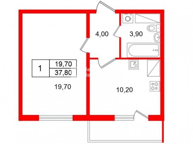 Общая площадь квартиры 37,8 м2, комната 19,7 м2, просторная кухня 10,2 м2 с выходом на застекленную лоджию. Высота потолков 2,72м.