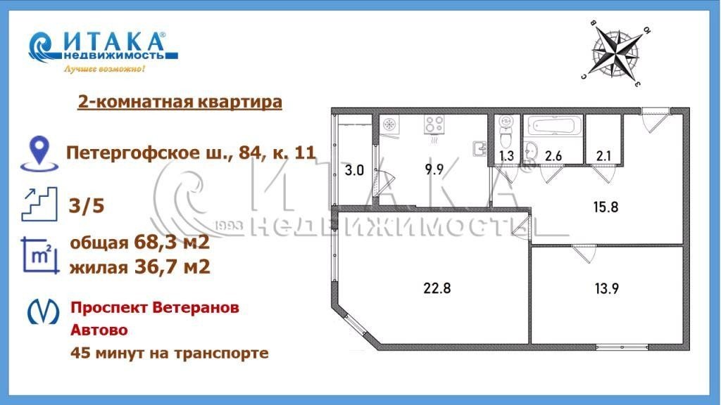 Продажа двух-комнатной квартире в Красносельском районе СПб. Площадь квартиры: 68.3 м2, жилая площадь: 36.7 м2, площадь кухни: 9.9 м2, 3/5 этаж. Цена 10 800 тыс. руб. Описание, информация о продавце.