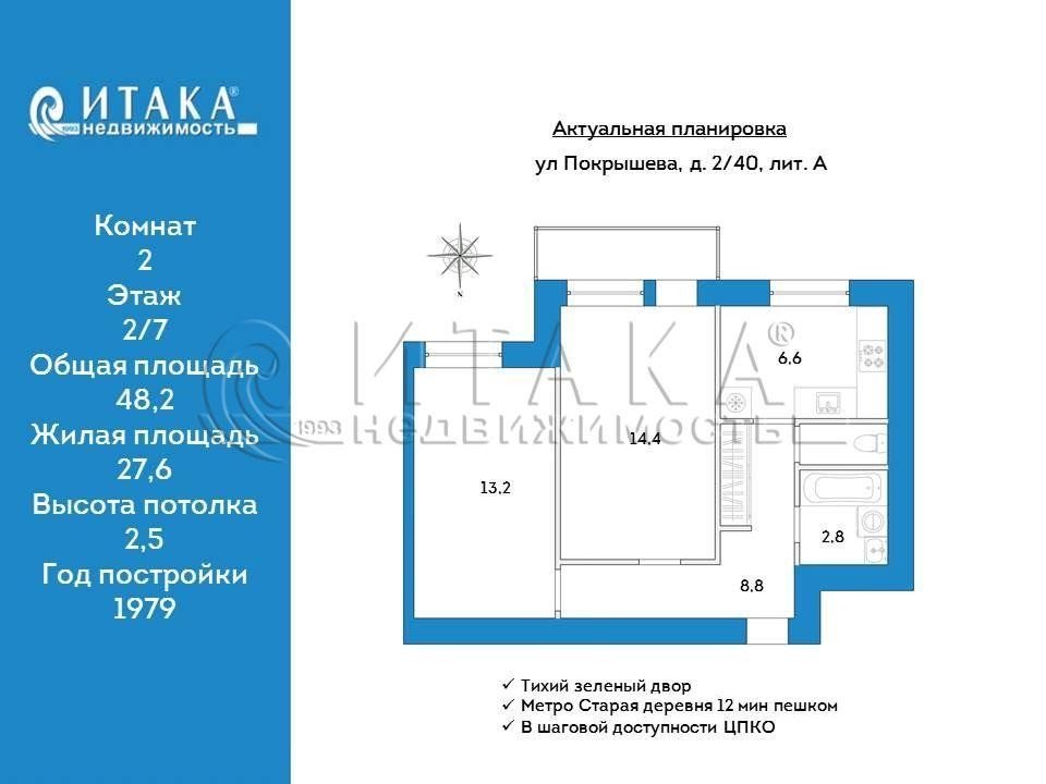 Продажа двух-комнатной квартире в Приморском районе СПб. Площадь квартиры: 48.2 м2, жилая площадь: 27.6 м2, площадь кухни: 6.6 м2, 2/7 этаж. Цена 13 800 тыс. руб. Описание, информация о продавце.