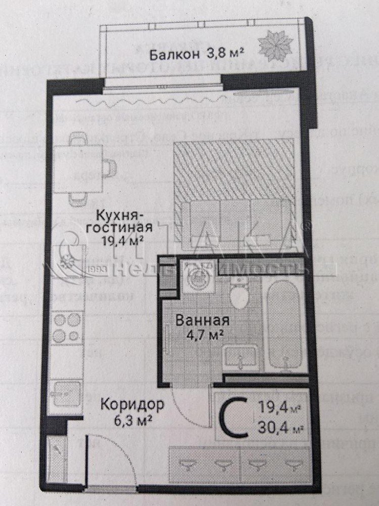 Площадь студии 30,4 кв.м, вместительный коридор 6,3 кв.м., просторный санузел 4,7 кв.м., кухня-гостиная 19,4 кв.м.