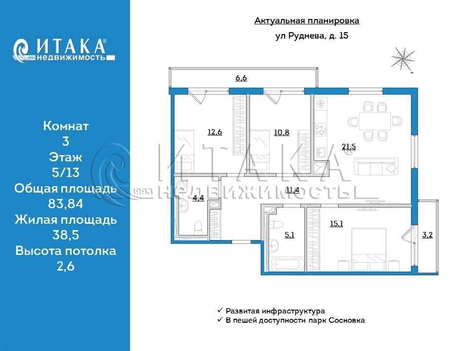 1-90955 В продаже 3-комнатная квартира в ЖК «Руднева 15» – идеальное пространство для счастливой семьи!