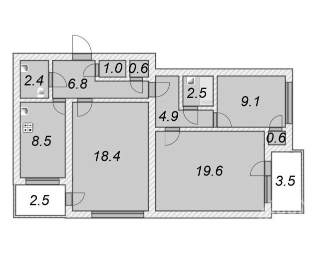 Две лоджии - 2,5+3,5 кв.м. (в общую площадь не входят)