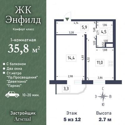 #8876255# Арт. 114978899 Предлагаем Вашему вниманию однокомнатную квартиру в ЖК Энфилд. Дом комфорт класса.В тихом зеленом районе с хорошей транспортной доступностью. О КВАРИТЕ Квартира расположена на 5-м этаже. Общая площадь – 35,8 кв.м. (без учета балкона).Просторная комната (14,4 кв.м.), уютная кухня (11,0 кв.м.), совмещенный санузел. Прихожая, где есть встроенный шкаф для хранения вещей, что очень удобно. Высота потолков 2,7 м. Установлены качественные стеклопакеты. Есть застекленный балкон – идеальное место для отдыха или создания рабочей зоны. Окна квартиры выходят на тихий двор. Современные удобства – комфорт и стиль в каждой детали. О ДОМЕ и ИНФРАСТРУКТУРЕ Дом 2019 года постройки, кирпично-монолитный от застройщика Арсенал. Красивые входные группы. Установлены бесшумные лифты, подземный паркинг, видеонаблюдение. Доброжелательные соседи. Около дома всегда можно найти место для парковки. Рядом гипермаркет Лента и ТЦ Китайский Квартал, кофейни, пункты выдачи доставки. Недавно открылись новые: поликлиника и отделение полиции. В нескольких минутах езды "Северный молл", "Гранд-Каньон", "МЕГА-Парнас". В центре района расположена школа на 950 мест, которая считается лучшей англоязычной школой в Санкт-Петербурге и Ленобласти и два детских сада. Хорошее транспортное сообщение. До остановки абщественного транспорта 5 минут пешком. До метро Девяткино /метро Пр.Просвещения -10 минут транспортом или 20-30 минут пешком, до метро Парнас - 20 минут транспортом удобный выезд на КАД и на Приозерскую трассу. О ДОКУМЕНТАХ Квартира с чистой юридической историей. Быстрый выход на сделку. 1 взрослый собственник. Никто не зарегистрирован. Прямая продажа. Не упустите возможность стать владельцем этой замечательной квартиры в прекрасном районе. Звоните сейчас для организации просмотра!