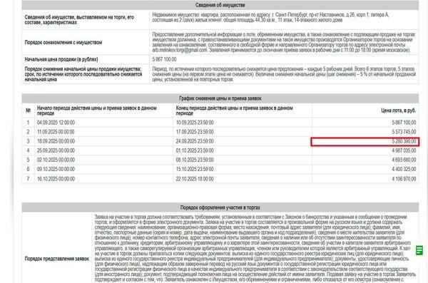 #8876900# Арт. 116196971 2-ккв 44,30 кв. м., 11 этаж, 14-этажного дома 1984 г.п., ЖСК. Комнаты раздельные 11,4+12,9 кв. м, кухня 7,4 кв. м, из кухни балкон, коридор 7,7 кв. м, с/у раздельный, кладовка.Собственность с 2020 г. с по свидетельству о праве на наследство по закону. До этого была приватизация в 2007 г. Собственник В браке не состоит. На иждивении несовершеннолетних детей нет.А в 2022 году был взят кредит под залог квартиры, который не погашен. В результате чего собственник квартиры принял решение о собственном банкротстве и подал заявление в Арбитражный суд, который и признал его несостоятельным (банкротом).Квартира реализуется по 127 Федеральному закону, с торгов в форме публичного предложения. Процедура разбита на интервалы по 5 дней с последовательным снижение цены на каждом следующем на 5%. В одном из фото есть график снижения. Указанная цена действительна до 24 сентября. Покупка возможна только за счет собственных средств. Ипотека, субсидии, сертификаты для оплаты не подойдут.Сопровождаем сделку на всех этапах - от участия в торгах, регистрации права собственности, физическое и юридическое освобождение квартиры. Все просто и безопасно!Перед звонком обязательно посмотрите видео . Там все подробно рассказываю и показываю.На оставшиеся вопросы отвечу. Лучше звонить чем писать!