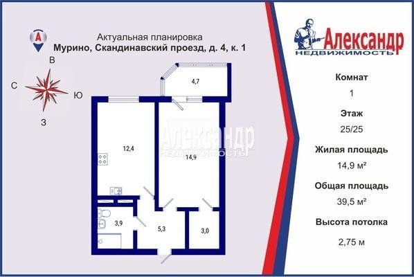 Продажа одно-комнатной квартире во Всеволожском районе. Площадь квартиры: 39.5 м2, жилая площадь: 14.9 м2, площадь кухни: 12.4 м2, 25/25 этаж. Цена 10 700 тыс. руб. Описание, информация о продавце.