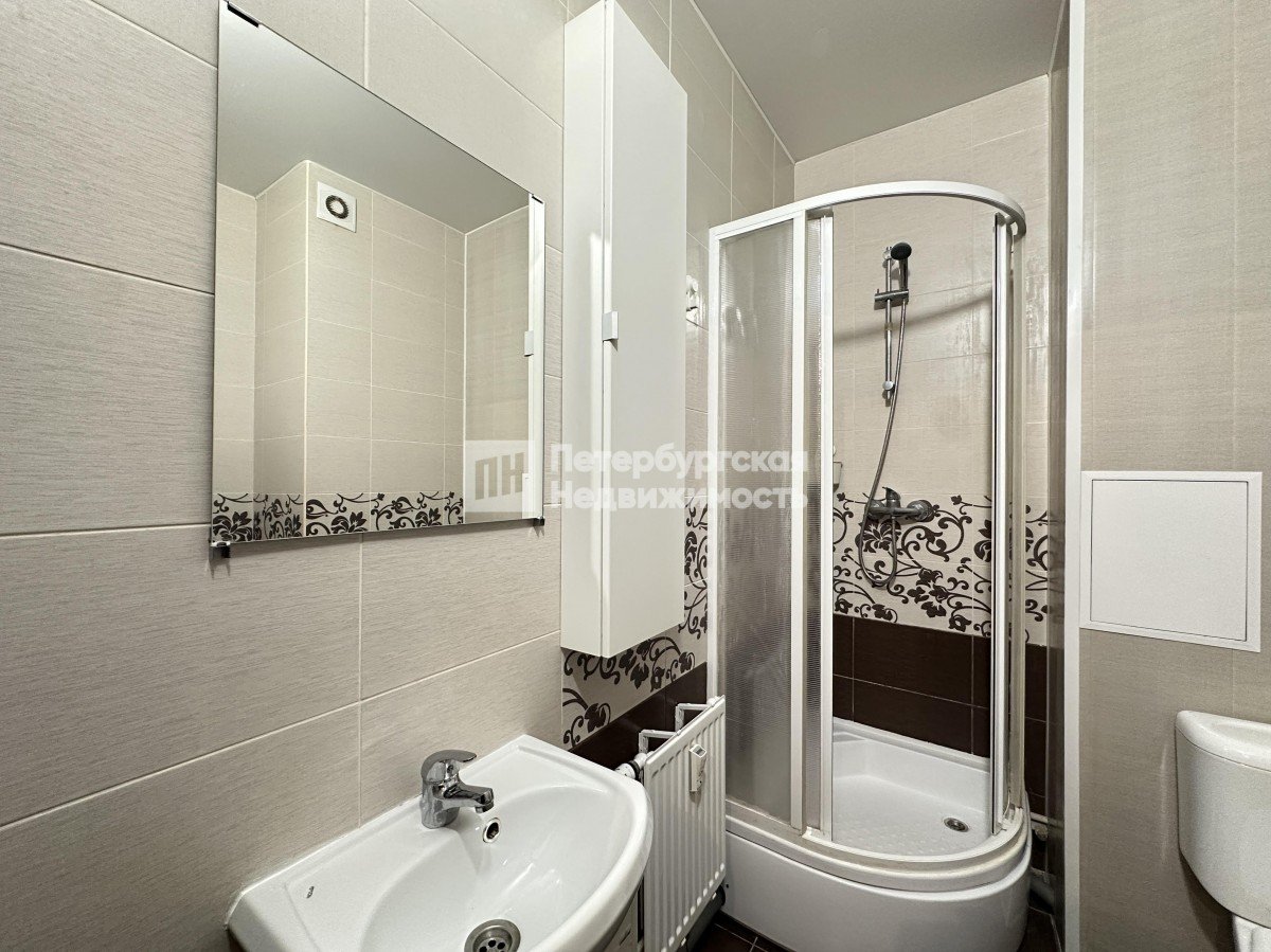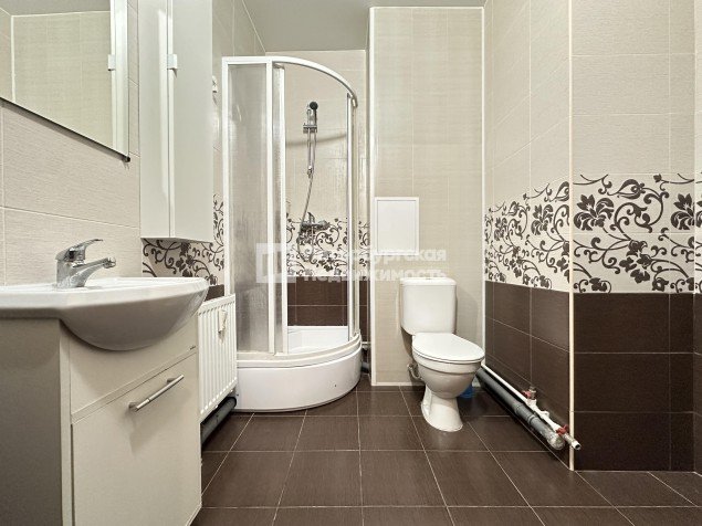 • в с/у - керамическая плитка на полу и стенах, навесной шкаф, тумба, зеркало, унитаз, душевой поддон. Предусмотрено место под стиральную машинку