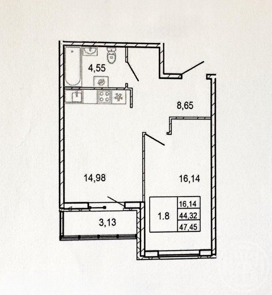 Общая площадь - 44,3 кв.м.