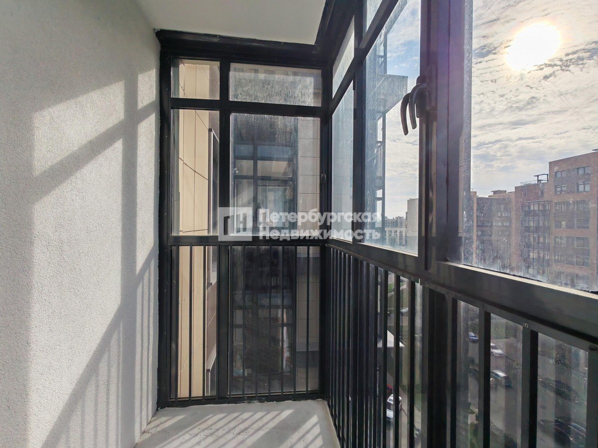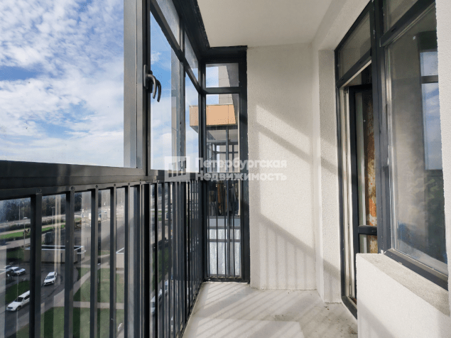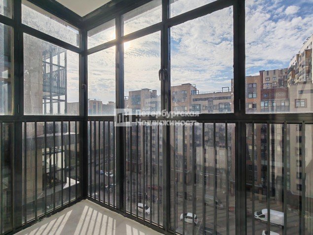 Большой застекленный балкон с красивым видом.