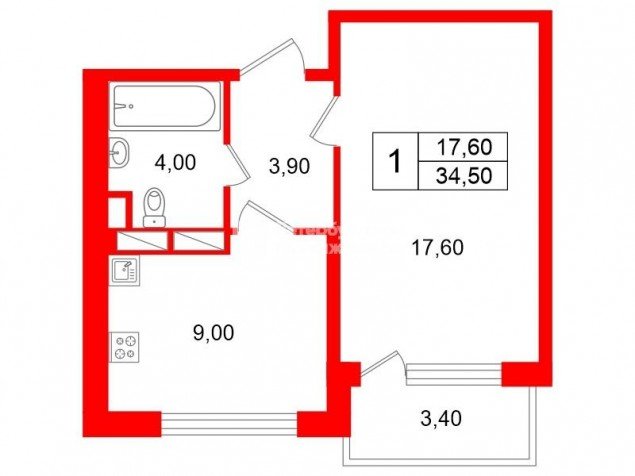 Жилая площадь составляет 17.6 кв. м, Кухня площадью 9 кв м.