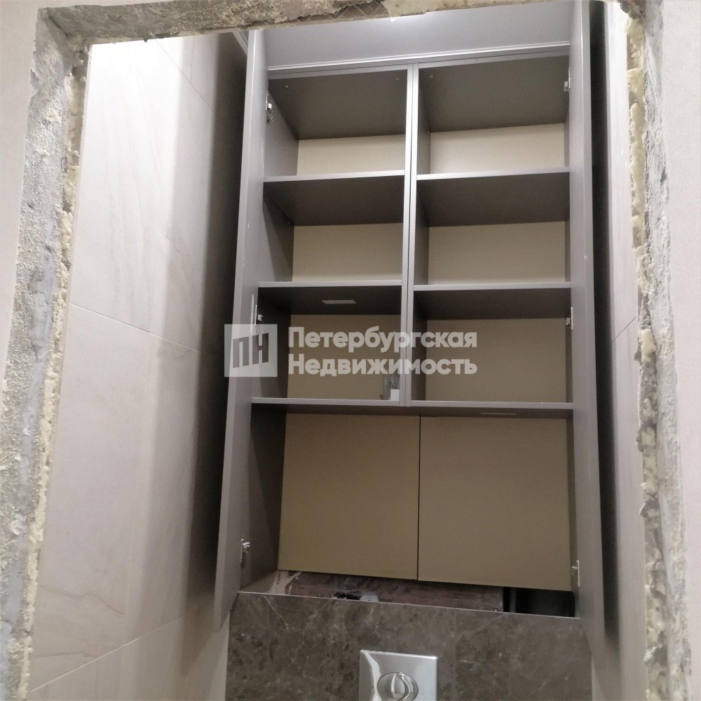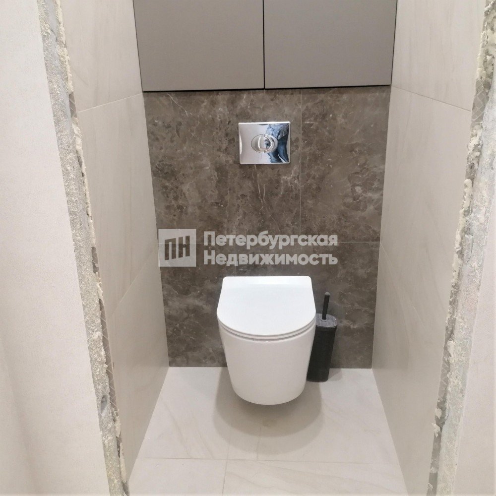 В туалете на стенах и полу керамогранит. Установлена инсталляция с унитазом, фирма Grohe. Сделана закрытая система хранения с доступом к счетчикам.