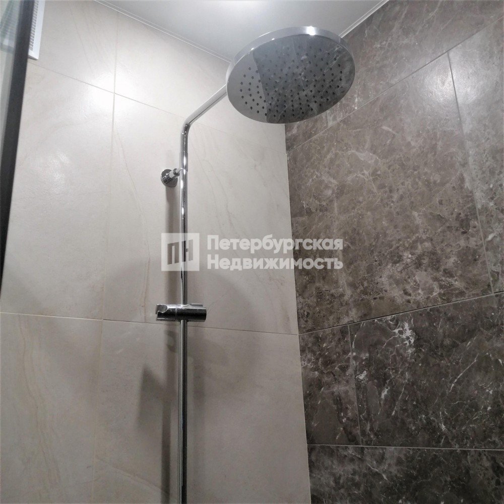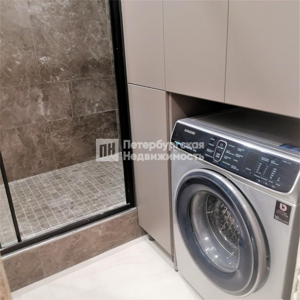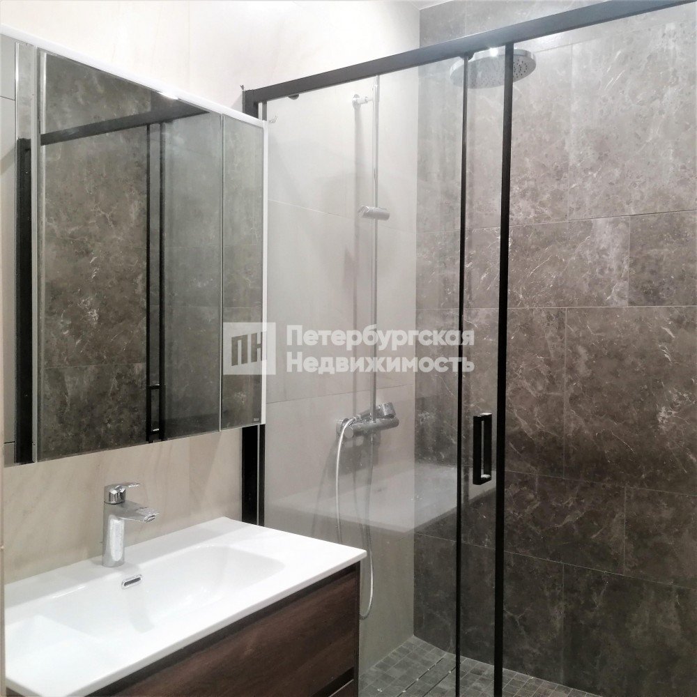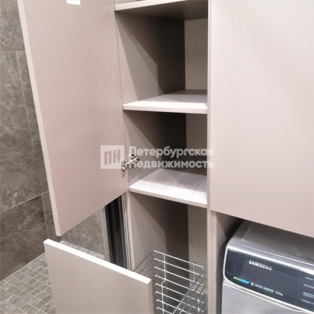 В ванной, сделана вместительная душевая кабина. Раковина встроена в шкаф с полками. Смеситель фирмы Grohe. Над раковиной навесной трехстворчатый шкаф с зеркальными дверями и подсветкой. Так же организована удобная система хранения с закрытыми шкафами.