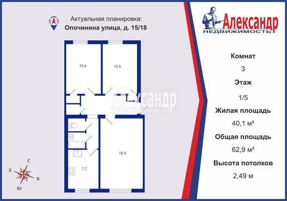 Продажа трех-комнатной квартире в Василеостровском районе СПб. Площадь квартиры: 62.9 м2, жилая площадь: 40.1 м2, площадь кухни: 7.7 м2, 1/5 этаж. Цена 16 000 тыс. руб. Описание, информация о продавце.
