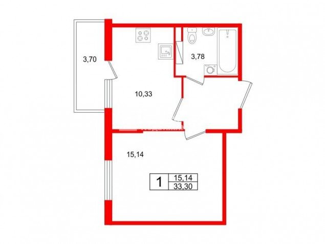 Общая площадь по документам 33,3 м2. Комната 15,14 м2, кухня 10,33м2, лоджия 3,7м2.