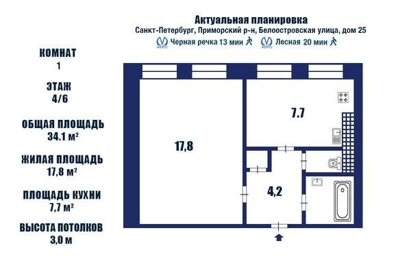#8879354# Арт. 117082096 Уникальная по планировке квартира расположена в Приморском районе на Белоостровской улице дом 25, в пешей доступности от метро Черная речка и Лесная. Данный микрорайон тихий, очень удобный для жизни в любом возрасте! Рядом парки, развитая инфраструктура, прекрасная архитектура Петроградского района, набережные Невы. Дом построен в 1910 году, но в 1988 году был сделан КАПРЕМОНТ !!!! Соответственно перекрытия железобетонные, при этом лифт поменян пару лет назад, поменяны стояки горячей и холодной воды. Комната 17,8 м прямоугольной формы с двумя окнами, кухня также отличной формы с двумя окнами!!!! Окна в зеленый двор, здание напротив меньшей этажности. Сан/узел раздельный, есть кладовая хорошей формы. Прелесть данной квартиры в том, что нет бесполезной площади, а высокие потолки 3 м (по форме 7 -3,3 м) придают пространству воздуха! Один собственник, более 10 лет, обременений нет. РАДУШНО ЖДЕМ ВЕЗУЧЕГО ПОКУПАТЕЛЯ !!!!!