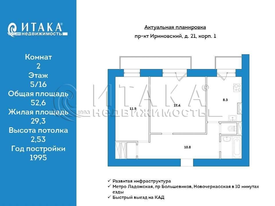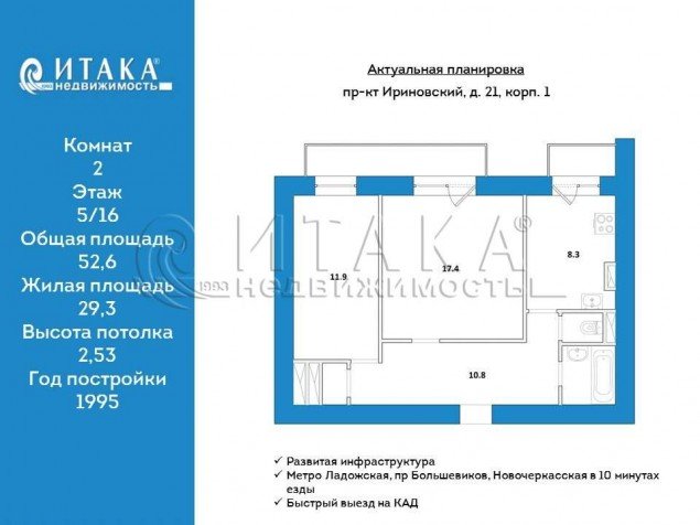 Продажа двух-комнатной квартире в Красногвардейском районе СПб. Площадь квартиры: 52.6 м2, жилая площадь: 29.3 м2, площадь кухни: 8.3 м2, 5/16 этаж. Цена 9 500 тыс. руб. Описание, информация о продавце.