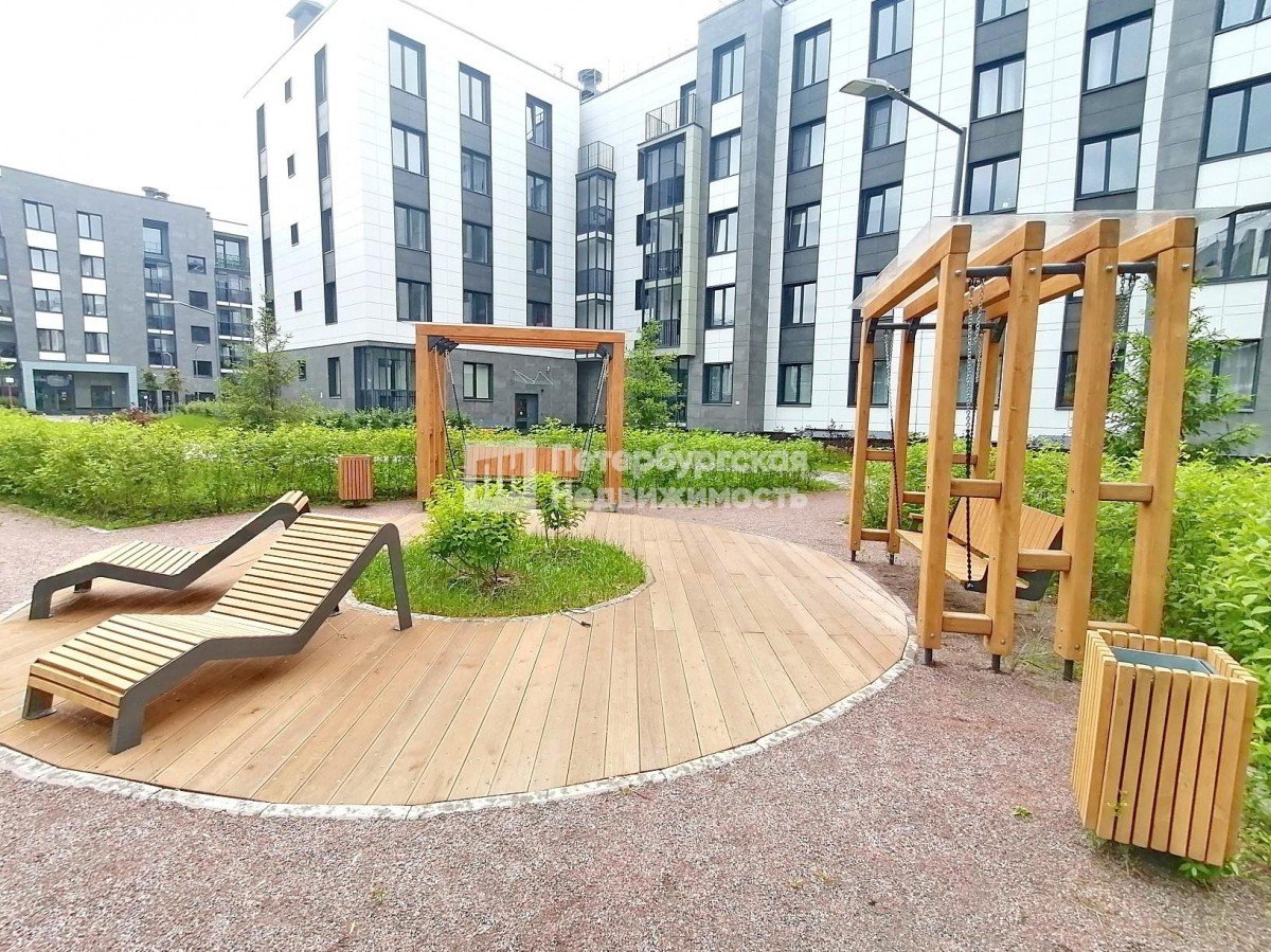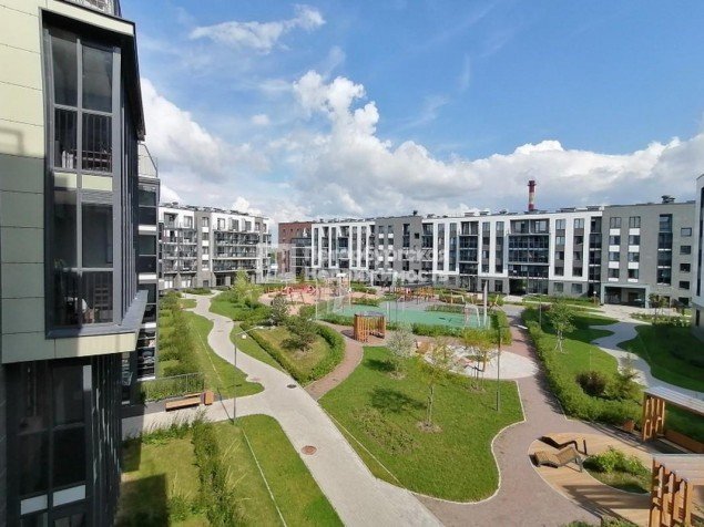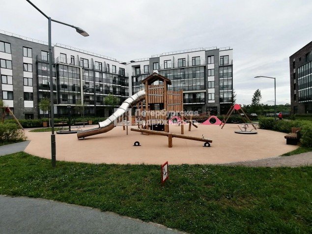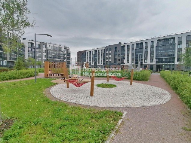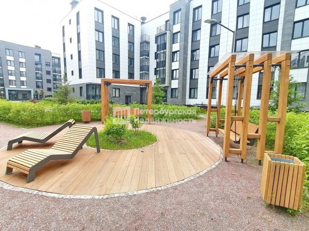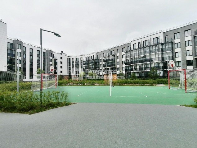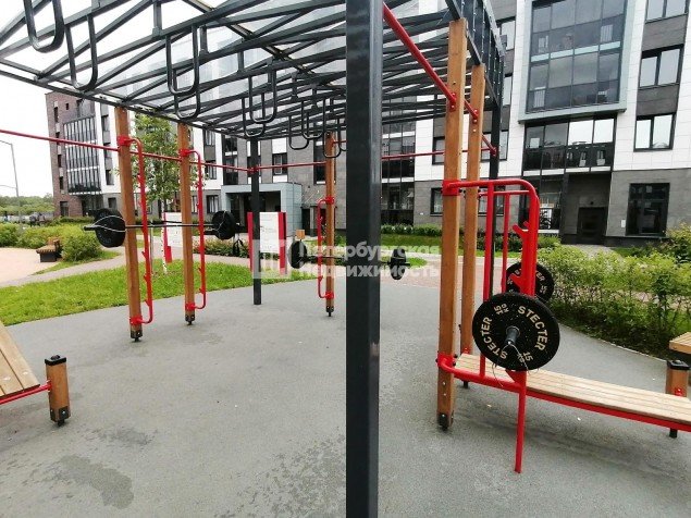Благоустроенный двор с зонами отдыха, где есть гамаки и деревянные лежаки, можно работать на свежем воздухе. Для активного отдыха спортивные зоны: футбольное поле, система турников, штанги.