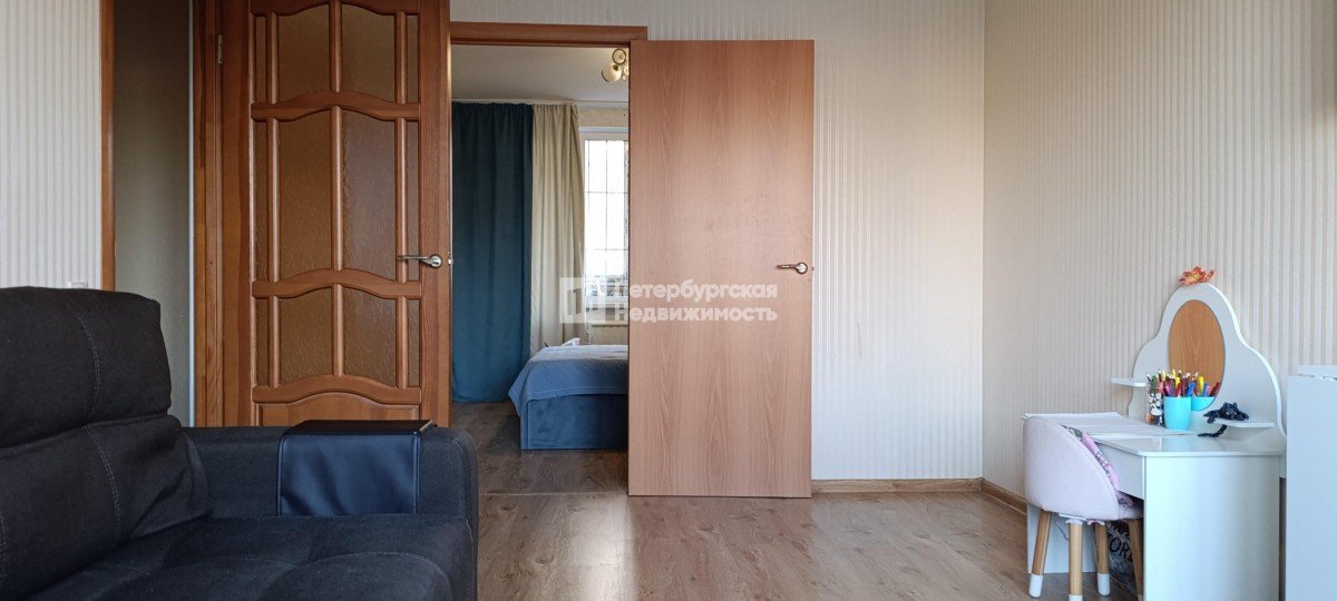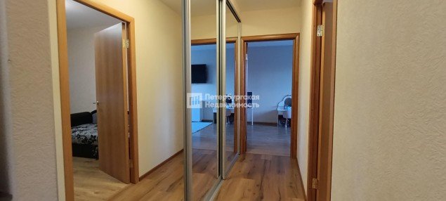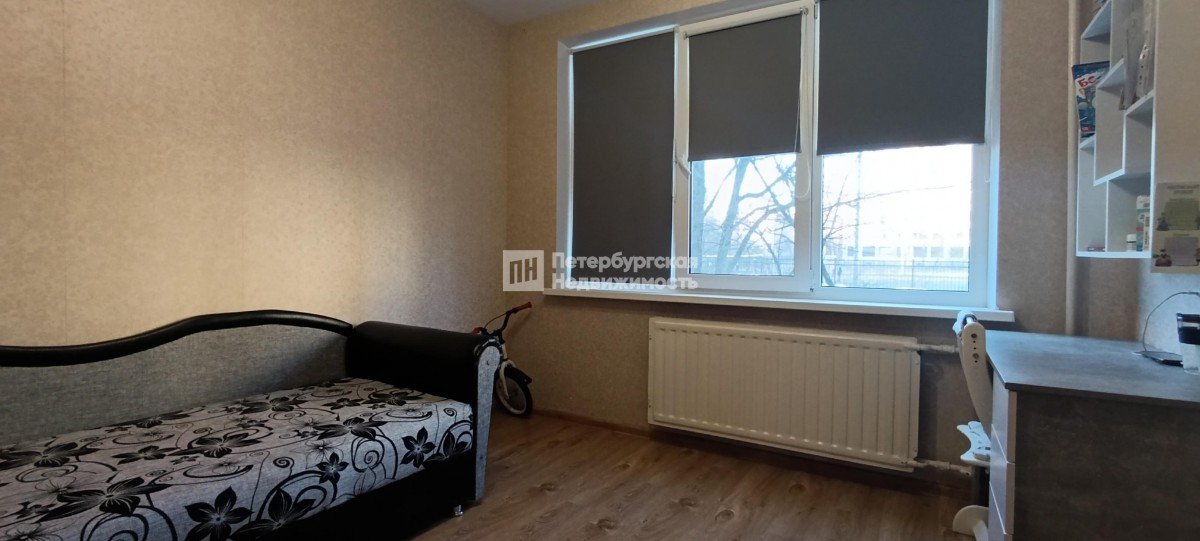Окна выходят на 2 стороны с видом на палисадник с одной стороны и стадион с другой стороны. Нет эффекта «окна в окна». В прихожей и коридоре установлены 2 больших встроенных шкафа с местами для хранения, которые останутся покупателю.