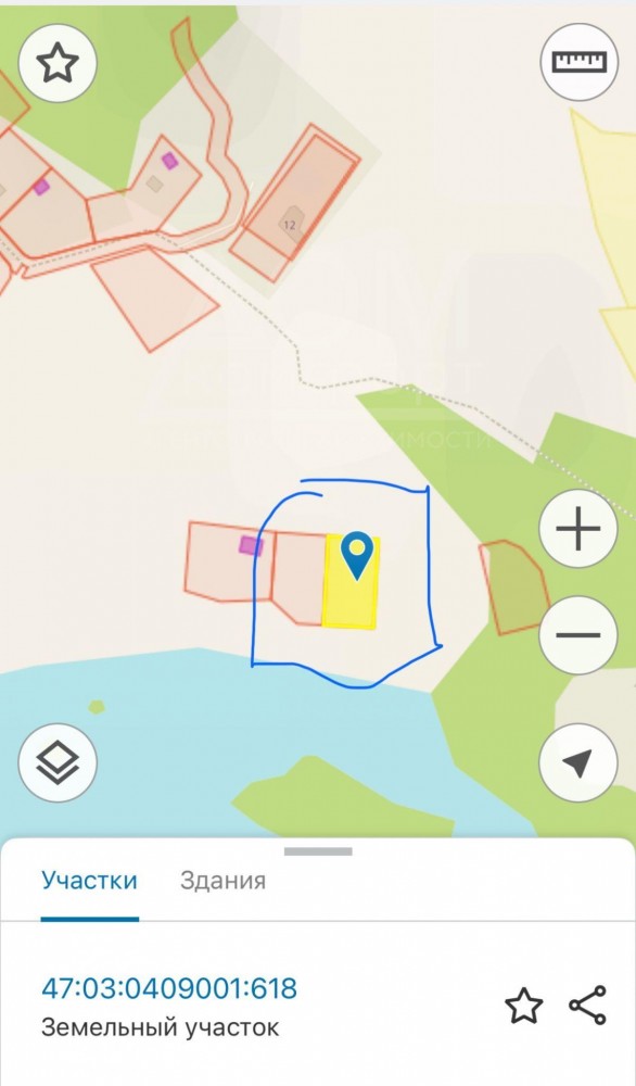 Участок состоит из двух кад. номеров 47:03:0409001:618 и 47:03:0409001:617, продаётся одним лотом.