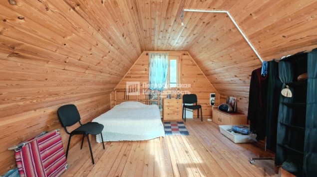 На 1 этаже два раскладных дивана, 2 кресла, столик, комод. Есть отделение для кухни. Установлен кухонный гарнитур, умывальник с электрическим обогревателем, холодильник, инвекторная плитка. На втором этаже кровать, вешалки, стол.
