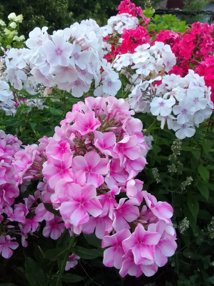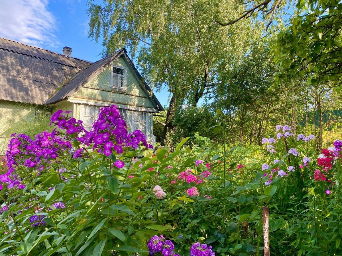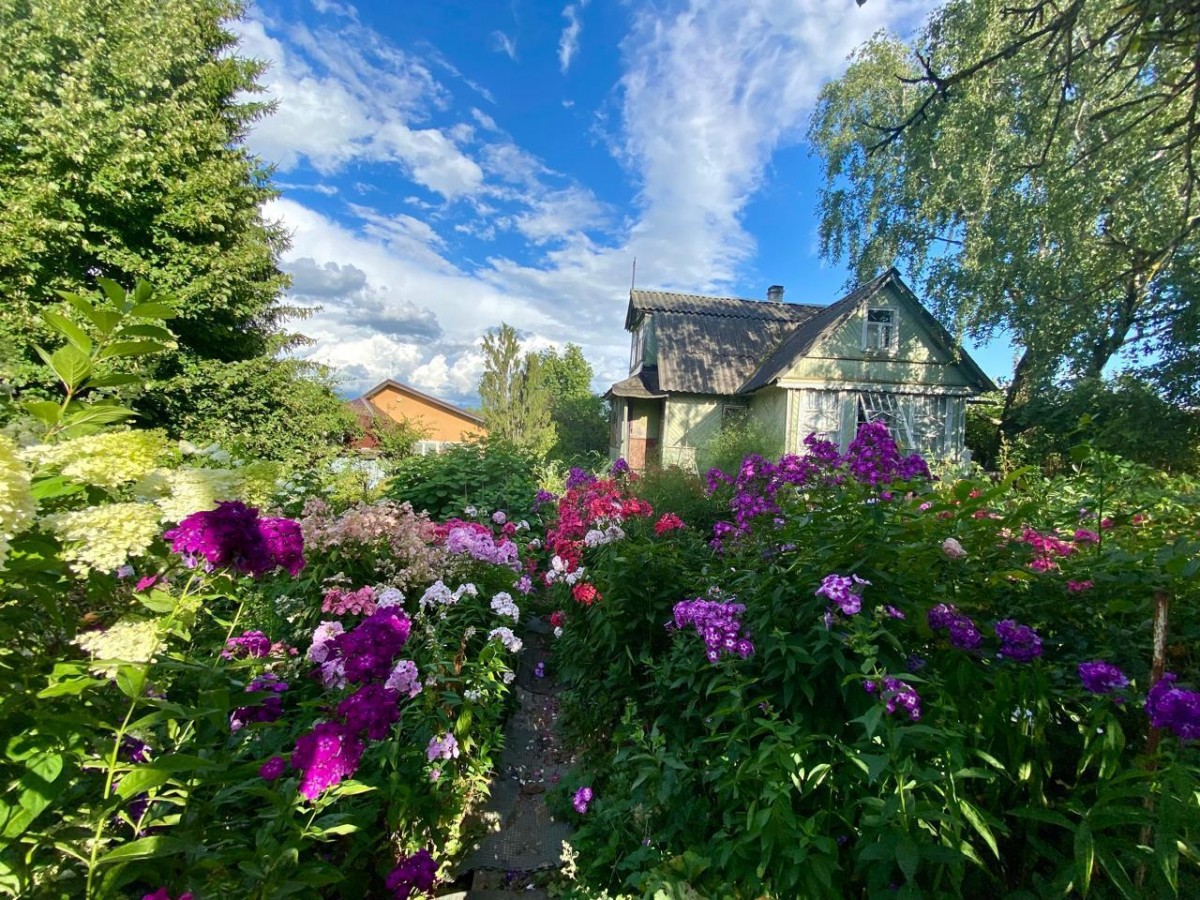 В саду море цветов, редкие сорта гортензии, флоксы, пионы, плодоносящие деревья и кустарники (яблони, вишни, сливы, малина, кусты черной и красной смородины).