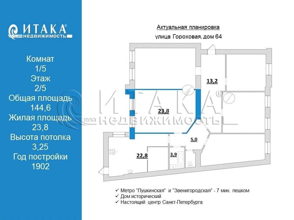 1-91082 Предлагается к покупке отличная комната в отличной квартире. Комната 23,8 кв.м., удобной геометрии с двумя окнами. В квартире еще 3 комнаты, из которых две в собственности у одной проживающей, 4-я комната принадлежит собственнику, в которой она и проживает. 5-ая комната муниципальная. Квартира содержится в чистоте, в коридоре и на кухне у каждого выделены свои места, ванная комната большая, поэтому 3 стиральные машины (каждого собственника) там установлены. Вход в подъезд со двора, двор закрыт. Окна комнаты выходят в достаточно просторный светлый двор. Дом исторический 1902 года постройки. Отличная локация, одно из преимуществ - равно удалённость (7 минут от ст. метро Пушкинская и Звенигородская). Настоящий центр Санкт Петербурга. Об этом доме можно много рассказывать интересного, но моя задача заинтересовать Вас покупкой этой комнаты. Преимуществ у нее много .Высота потолка 3.25 . Звоните, расскажем и покажем